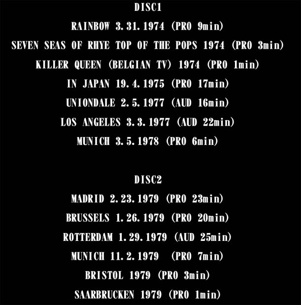 | ◁Eb>啁E??説昁E/b>◁E/td> | QUEEN SUPER RARE CLIPS COLLECTION 1974-1979 TIME 139min RANK A-B PRO/AUD SHOT DISC1 RAINBOW 3.31.1974 (PRO 9min) SEVEN SEAS OF RHYE TOP OF THE POPS 1974 (PRO 3min) KILLER QUEEN (BELGIAN TV) 1974 (PRO 1min) IN JAPAN 19.4.1975 (PRO 17min) UNIONDALE 2.5.1977 (AUD 16min) LOS ANGELES 3.3.1977 (AUD 22min) MUNICH 3.5.1978 (PRO 6min) DISC2 MADRID 2.23.1979 (PRO 23min) BRUSSELS 1.26.1979 (PRO 20min) ROTTERDAM 1.29.1979 (AUD 25min) MUNICH 11.2.1979 (PRO 7min) BRISTOL 1979 (PRO 3min) SAARBRUCKEN 1979 (PRO 1min) |