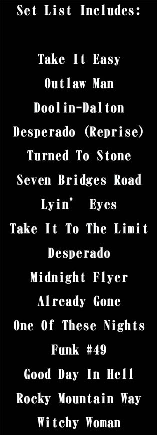 | ◁Eb>啁E??説昁E/b>◁E/td> | EAGLES The Kingdome SEATTLE,WA 8.6.1976 TIME 94min RANK A PRO SHOT Set List Includes: Take It Easy Outlaw Man Doolin-Dalton Desperado (Reprise) Turned To Stone Seven Bridges Road Lyin EEyes Take It To The Limit Desperado Midnight Flyer Already Gone One Of These Nights Funk #49 Good Day In Hell Rocky Mountain Way Witchy Woman |