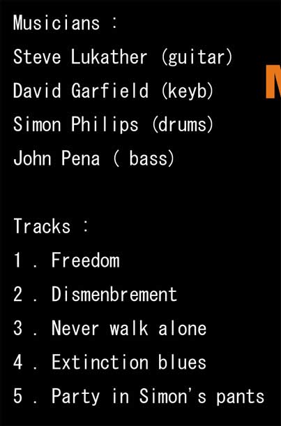 | ◁Eb>啁E??説昁E/b>◁E/td> | LUKATHER (TOTO) Lobotomys Montreux'94 TIME 53min RANK A PRO SHOT Musicians : Steve Lukather (guitar) David Garfield (keyb) Simon Philips (drums) John Pena ( bass). Tracks : 1 . Freedom 2 . Dismenbrement 3 . Never walk alone 4 . Extinction blues 5 . Party in Simon's pants |
